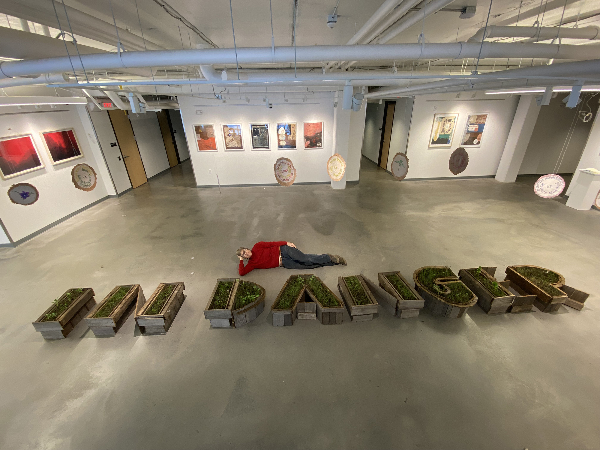 Vanishing Flora is an installation with several elements. On the floor are boxes in the shape of letters which spell In Danger planted with 28 different kinds of Native prairie seeds. Above the planted letter shaped boxes are a dozen hand drawn images of endangered species. For the opening next to the drawn images are pulp paintings of those same images encased in the ice. Because the pulp painting was done directly in the ice and not pressed, as the ice melted the image dissolved, watering the prairie seeds below. Vanishing Flora is a statement about our disappearing natural environment and all of us are in danger because of it.